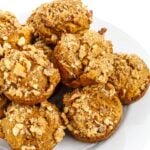 In a small bowl, combine remaining 2 tablespoons walnuts and 2 tablespoons of brown sugar and carefully sprinkle the top of each muffin with the mixture before placing pan in the oven.