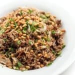 A classic Lebanese weeknight dinner recipe, hushwee rice is cooked in clarified butter and seasoned with cinnamon then topped with shredded chicken and toasted pine nuts.