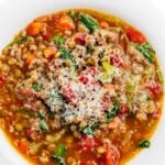 Rich and hearty lentil soup is made with sweet Italian sausage, tender veggies and fire roasted diced tomatoes. A fast and easy weeknight dinner recipe!