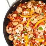 To the hot pan, add the sliced onions, peppers, garlic, and another pinch of salt and pepper. Saute until peppers and onions are tender and slightly caramelized, about 7-9 minutes, stirring frequently.