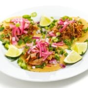 Serve pork in corn tortillas and garnish with reserved pickled red onions and minced cilantro.