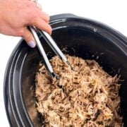 Remove the cooked pork from the slow cooker and let cool 10 minutes before shredding with two forks.