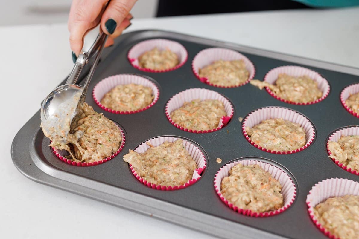 - Using a 1/4 cup or an ice cream scoop, carefully fill each muffin cup.