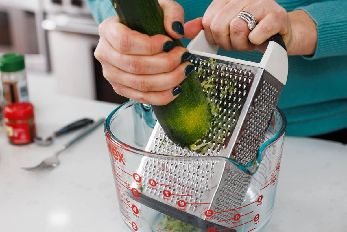 Start your muffins by taking your zucchini and grating it into a medium sized bowl.