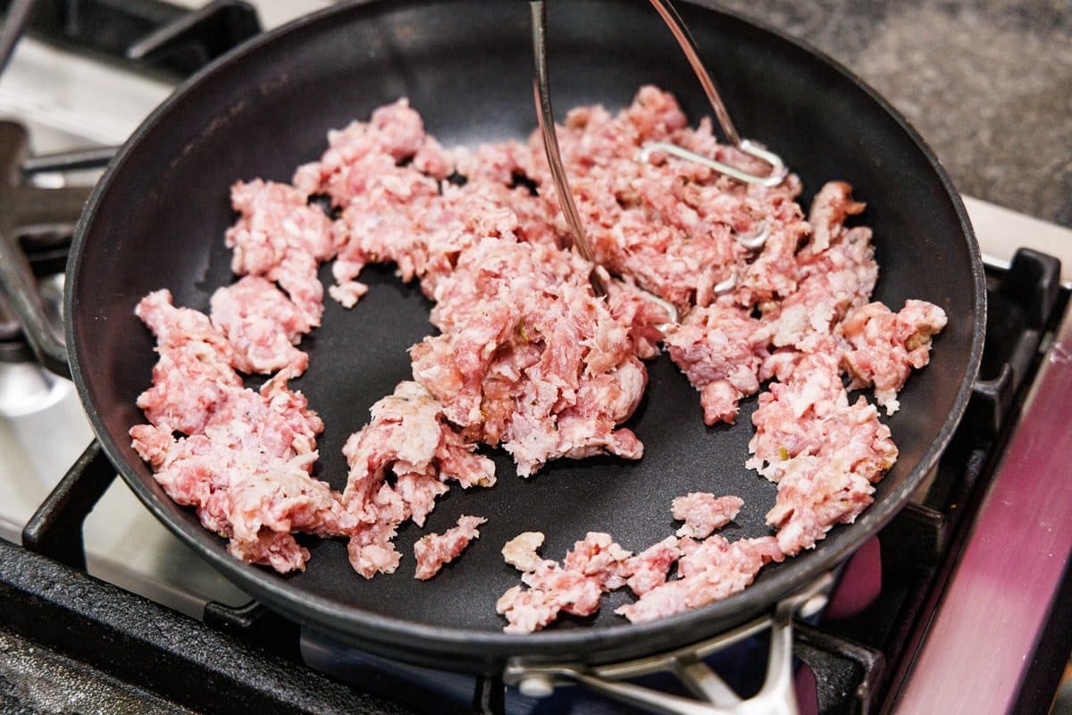 Step 1. Cook your sausage over medium-high heat in a large skillet, crumbling into small pieces.