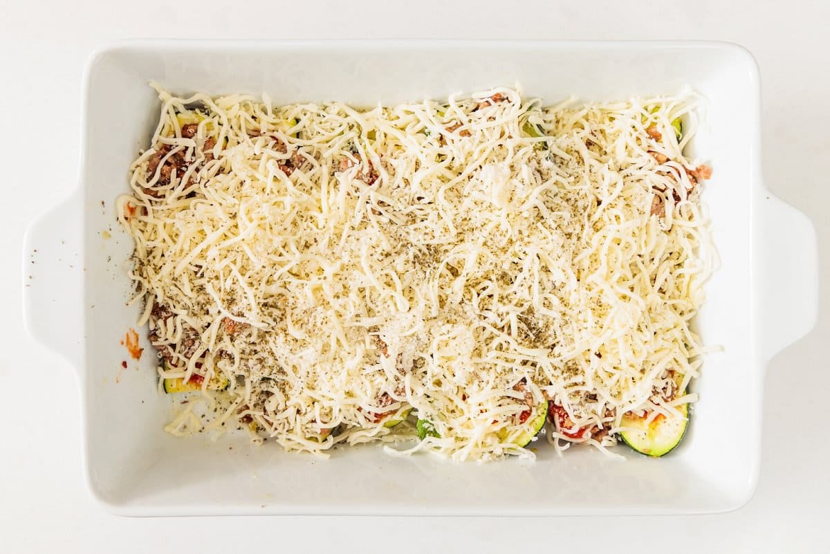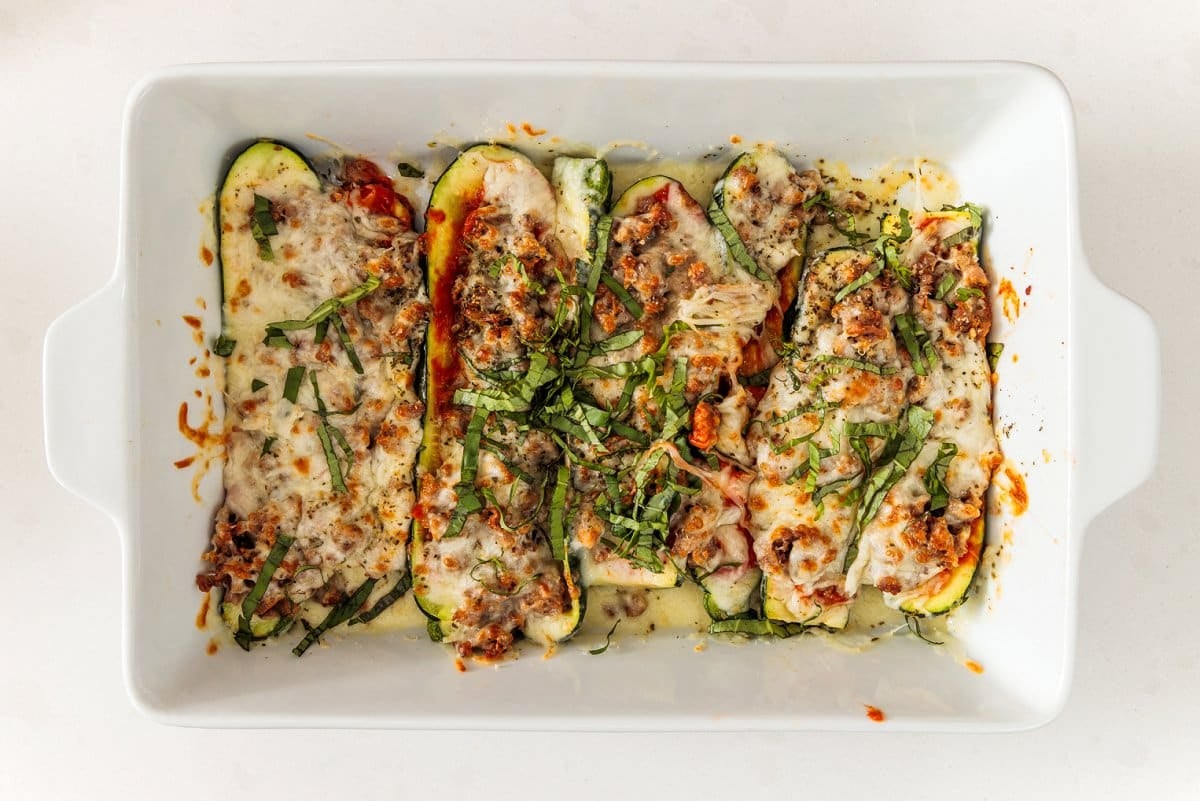 - Remove zucchini from oven and pat any moisture that may have accumulated with paper towel. Spread about two tablespoons of marinara sauce in the middle of each zucchini half then top with cooked Italian sausage crumbles, mozzarella cheese and a sprinkle of parmesan. Repeat until all halves are filled then bake for 5 minutes before turning oven to broil then broiling for 3-4 minutes until golden brown. Serve with optional garnish of fresh basil and chili flakes.1 cup marinara sauce, 16 ounces shredded part-skim mozzarella, 1/4 cup grated Parmesan cheese, fresh basil and chili flakes